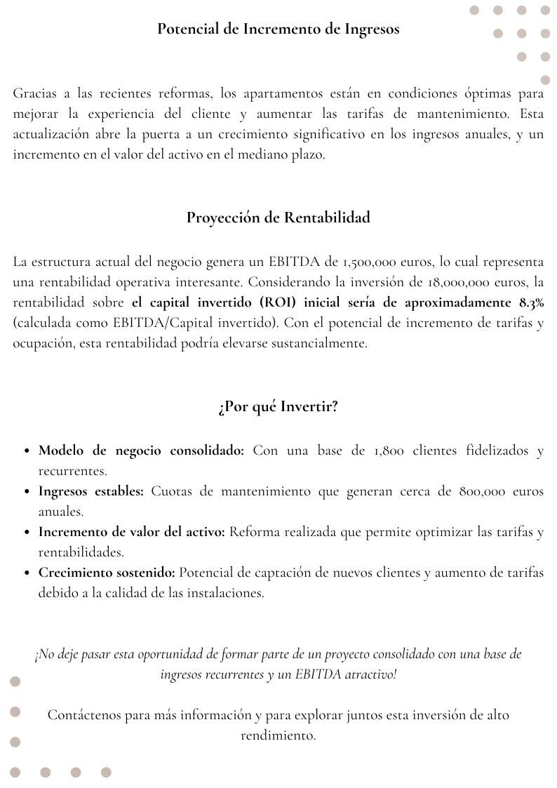 La estructura actual del negocio genera un EBITDA de 1,500,000 euros, lo cual representa una rentabilidad operativa interesante. Considerando la inversión de 18,000,000 euros, la rentabilidad sobre el capital invertido (ROI) inicial sería de aproximadamente 8.3%(calculada como EBITDA/Capital invertido). Con el potencial de incremento de tarifas y ocupación, esta rentabilidad podría elevarse sustancialmente.