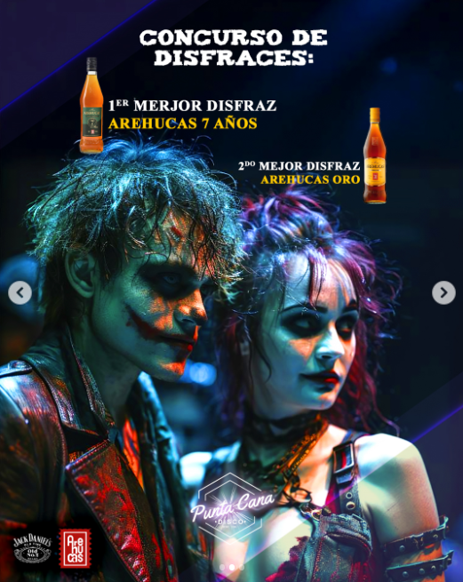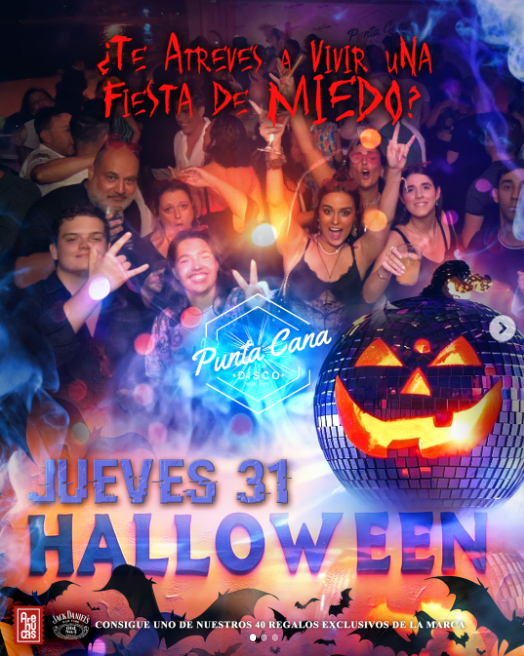 En Pub Punta Cana 𝗝𝗨𝗘𝗩𝗘𝗦 𝟯𝟭 🎃 𝓗𝓪𝓵𝓵𝓸𝔀𝓮𝓮𝓷 llega con todo: misterio, locura y premios! ¿Te atreves? 😈 🔥 CONCURSO DE DISFRACES 🔥 ✨ Premiaremos a los dos mejores disfraces: 🥇 1er Premio: Botella de Arehuca 7 años 🍾 🥈 2do Premio: Botella de Arehuca Oro 🥃 Y por si fuera poco, los amigos de Jack Daniels 🥃 montan un stand lleno de REGALOS 🎁 y sorpresas que te van a dejar loco/a. 🔥 No te pierdas la noche más aterradora y divertida del año, llena de buen rollo, vibra salvaje y mucho ritmo. 🕺💃 ¡Corre a buscar tu mejor disfraz y vente a disfrutar del mejor ambiente de Los Cristianos!
